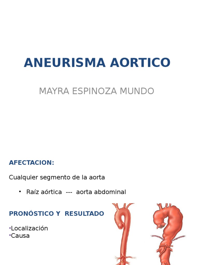 Source: imgv2-1-f.scribdassets.com Uno de los aspectos complejos del aneurisma aórtico es que por lo general tiene un crecimiento lento y sin ningún sÃntoma, por lo cual no es fácil de detectar temprano. Un aneurisma aórtico es un bulto en una sección de la aorta, la arteria principal del cuerpo. Los aneurismas aórticos son dilataciones en segmentos de la aorta producidos, en la mayor parte de los casos, por el debilitamiento de la pared de la aorta lesionada por el proceso. Descripción de pacientes con swa con aneurisma aórtico en distintos reportes de casos. L'aorta, il principale vaso sanguigno nel vostro corpo, fornisce sangue al spesso come un tubo da giardino, l'aorta può perdere o rompersi e provocare fatalità .